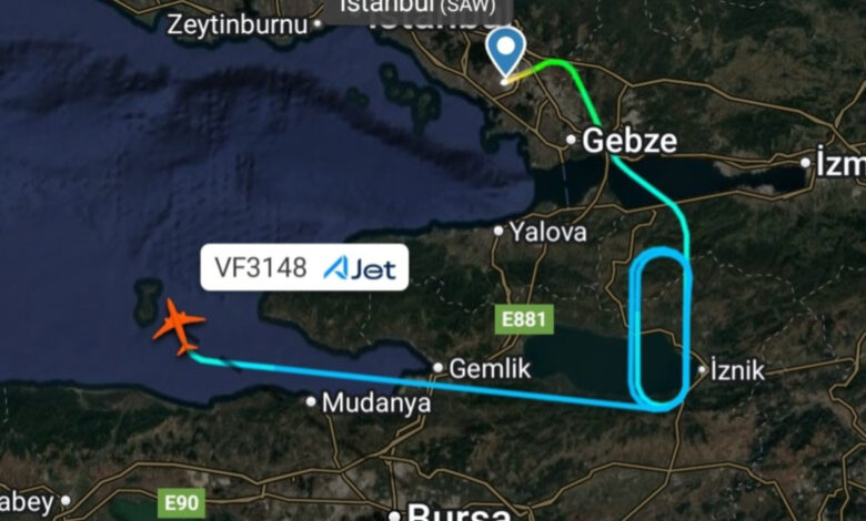 AJet’in #VF3148 Sabiha Gökçen – Çukurova seferini gerçekleştiren TC-JFD tescilli Boeing B737-800 tipi uçağı, kalkıştan kısa bir süre sonra henüz bilinmeyen bir nedenle Sabiha Gökçen Havalimanı’na geri döndü.