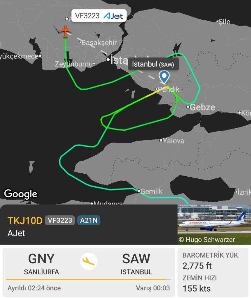 AJet’e ait #VF3223 sefer sayılı, TC-LUA tescilli Airbus A321neo tipi uçak, 11 Ağustos’ta Şanlıurfa GAP Havalimanı’ndan kalkarak İstanbul Sabiha Gökçen Havalimanı’na gitmek üzere havalandı. Ancak henüz bilinmeyen bir nedenle uçak İstanbul Havalimanı’na (İGA) divert etti.