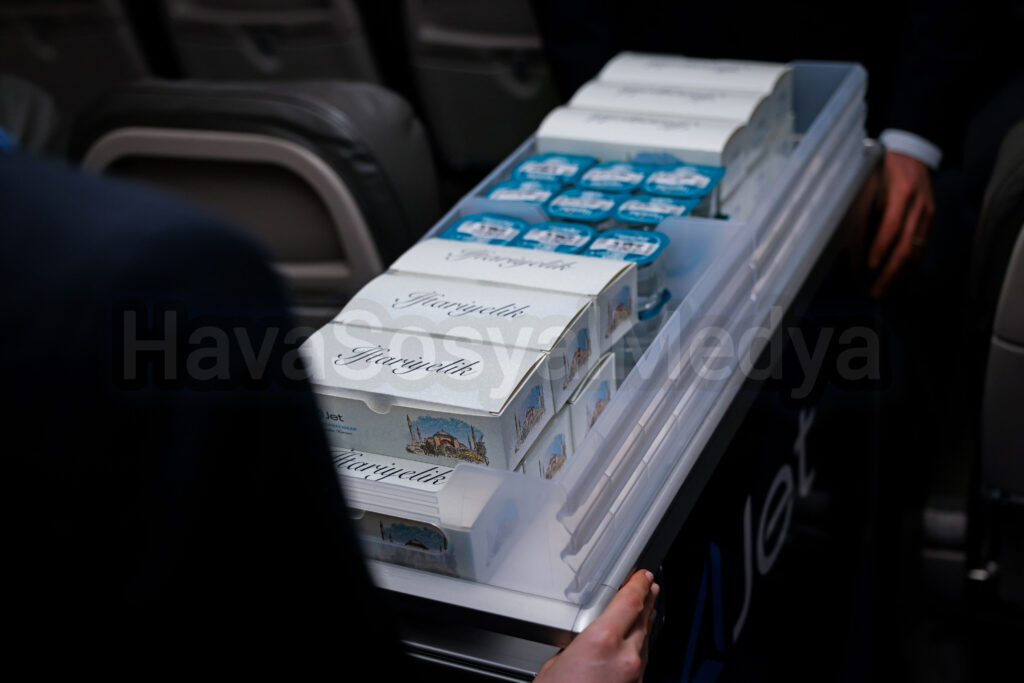 ✓ İkram içeriğinde pide ekmeğinde beyaz peynir, kırmızı biber ve zeytin ezmeli sandviç, hurma ile su bulunacak. Öte yandan, şirketin ücretli ikram konsepti kapsamında sunulan AJet Cafe ürünlerinin de uçuşlarda satışına devam edileceği belirtildi.