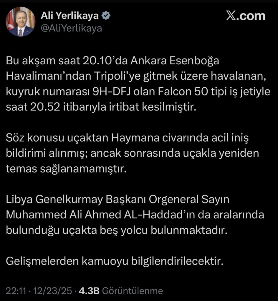 İçişleri Bakanı Ali Yerlikaya, bu akşam saat 20.10’da Ankara Esenboğa Havalimanı’ndan Libya’nın başkenti Trablus’a (Tripoli) gitmek üzere havalanan ve kuyruk numarası 9H-DFJ olan Falcon 50 tipi iş jetiyle saat 20.52 itibarıyla irtibatın kesildiğini açıkladı.