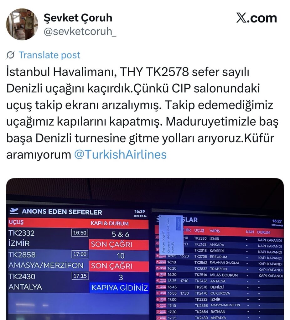 Tiyatro, sinema ve dizi oyuncusu Şevket Çoruh, Denizli’de sahne alacağı programa gitmek için İstanbul Havalimanı’ndan yapacağı uçuşta, CIP salonundaki ekranların çalışmaması nedeniyle uçağını kaçırdığına dair sosyal medya hesabında paylaşımda bulundu. Sonrasında Antalya’ya uçan Çoruh, kara yoluyla Denizli’deki programına yetişti.