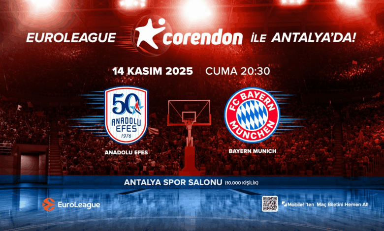 Avrupa basketbolunun en prestijli organizasyonu EuroLeague’in heyecanı bu kez Antalya’da yaşanacak. Anadolu Efes Spor Kulübü ile FC Bayern Munich arasında oynanacak EuroLeague karşılaşması; Corendon Turizm Grubu’nun ev sahipliğinde, Antalya Gençlik ve Spor İl Müdürlüğü ve Antalya İl Kültür ve Turizm Müdürlüğü’nün destekleriyle 14 Kasım 2025 Cuma günü saat 20.00’de Antalya 10.000 Kişilik Kapalı Spor Salonu’nda gerçekleşecek. Antalyalı sporseverler karşılaşmanın maç biletine Mobilet üzerinden ulaşabilecek.
