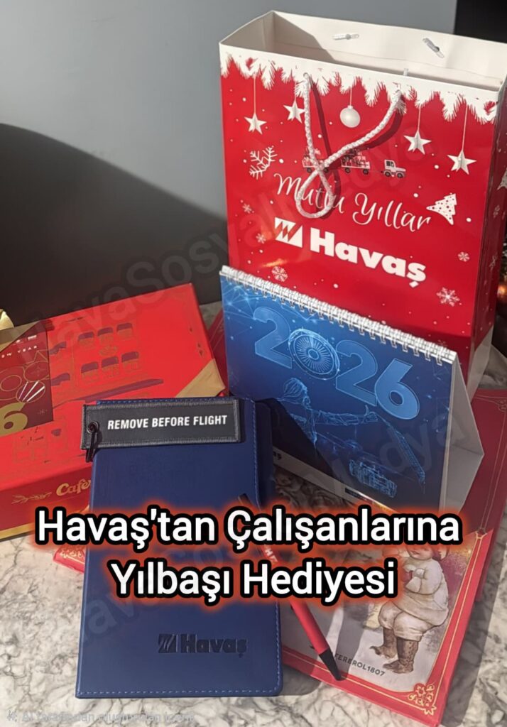 • Havaş Yer Hizmetleri, yılbaşı öncesinde çalışanlarına yılbaşı kutusu dağıtıyor. Kutunun içerisinde 2026 takvimi, ajanda, kalem, çikolata kutusu ve anahtarlık yer alıyor.