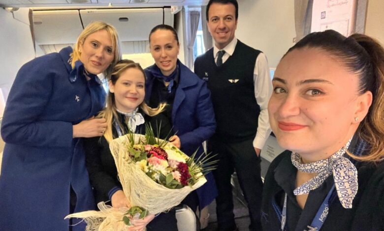 Son seferde bulunan Türk Hava Yolları kabin ekibi, günün anısına hatıra fotoğrafı çekildi.