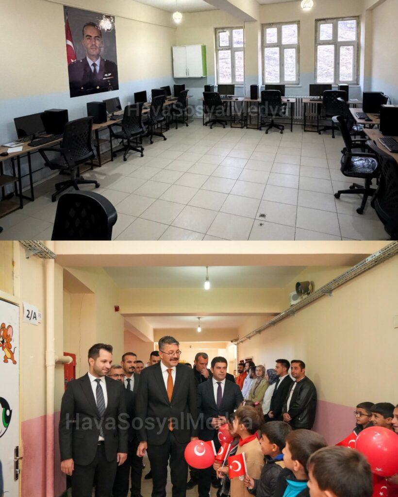 Hacı Salih Şen Okulu’nda açılan bilişim sınıfının yanı sıra tüm öğrencilere kişi başı iki parçadan oluşan kışlık kıyafet setleri hediye edildi.