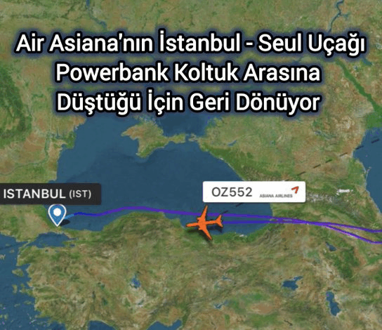 Asiana Airlines’ın #OZ552 İstanbul – Güney Kore / Seul seferini yapan HL7756 tescilli Boeing 777 tipi uçağında aldığımız bilgilere göre bir yolcunun powerbank (taşınabilir güç cihazı) cihazı koltuk arasına düştüğü için, Türkmenistan hava sahasındayken geri dönüş kararı aldı. Uçak İstanbul’a geri dönüyor.