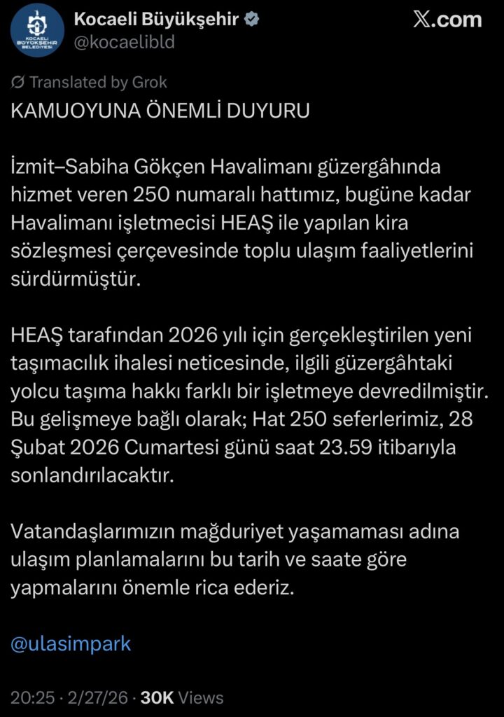 Kocaeli Büyükşehir Belediyesi, İzmit ile İstanbul Sabiha Gökçen Havalimanı arasında hizmet veren 250 numaralı hatla ilgili kamuoyuna açıklama yaptı.