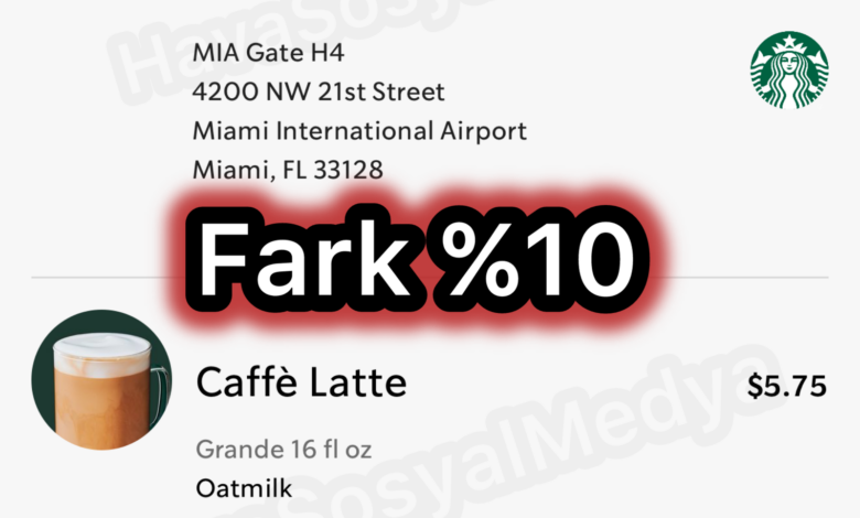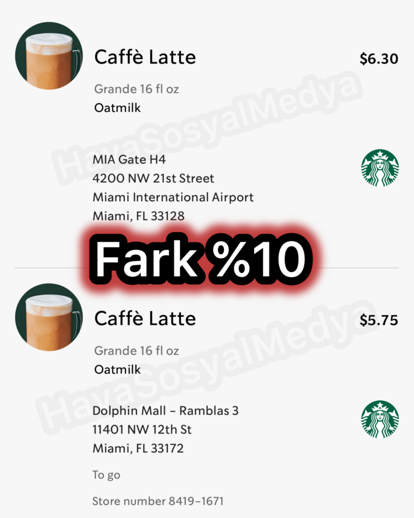 Miami’de bir lokasyonda fiyatı $5.75 olan latte, Miami Havalimanı’nda $6.30’a satılıyor. Yani şehirle havalimanı arasındaki fiyat farkı tam %9,6