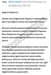 Pegasus’tan yapılan açıklamada “Değerli Adayımız,