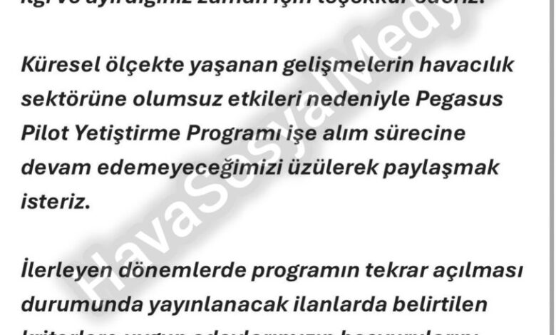 Küresel ölçekte yaşanan gelişmelerin havacılık sektörüne olumsuz etkileri nedeniyle Pegasus Pilot Yetiştirme Programı işe alım sürecine devam edemeyeceğimizi üzülerek paylaşmak isteriz.
