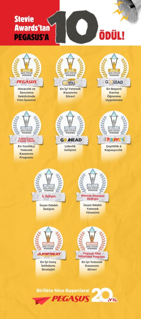 Pegasus Hava Yolları, insan kaynakları alanında dünyanın en saygın ödül platformlarından biri olan Stevie Awards for Great Employers 2025’te büyük bir başarıya imza attı. Şirket, bu yılki ödüllerde üçü altın, beşi gümüş ve ikisi bronz olmak üzere toplam 10 ödül kazandı.