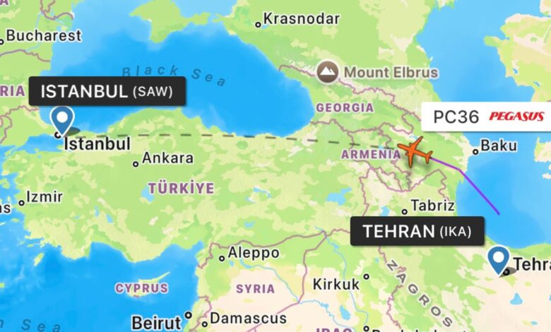 Pegasus’a ait TC-RBR tescilli Airbus A321neo, İran hava sahasının kademeli olarak yeniden açılmasının ardından Tahran’dan İstanbul Sabiha Gökçen Havalimanı’na doğru hareket etti.