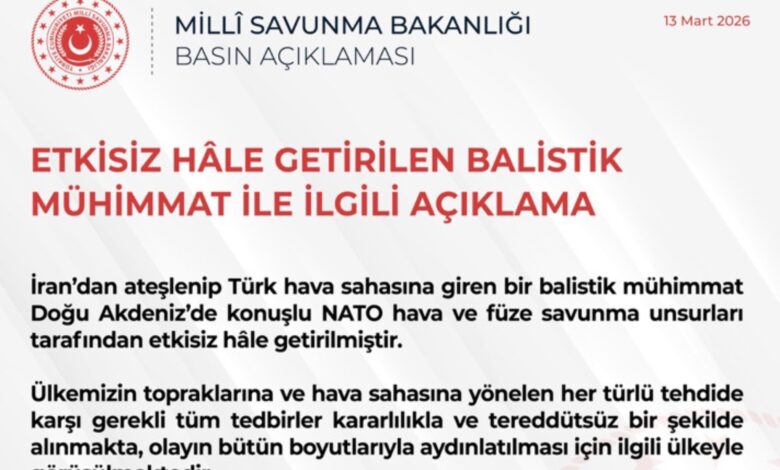 Millî Savunma Bakanlığı, İran’dan ateşlenerek Türk hava sahasına giren bir balistik mühimmatın NATO hava ve füze savunma unsurları tarafından etkisiz hâle getirildiğini açıkladı.