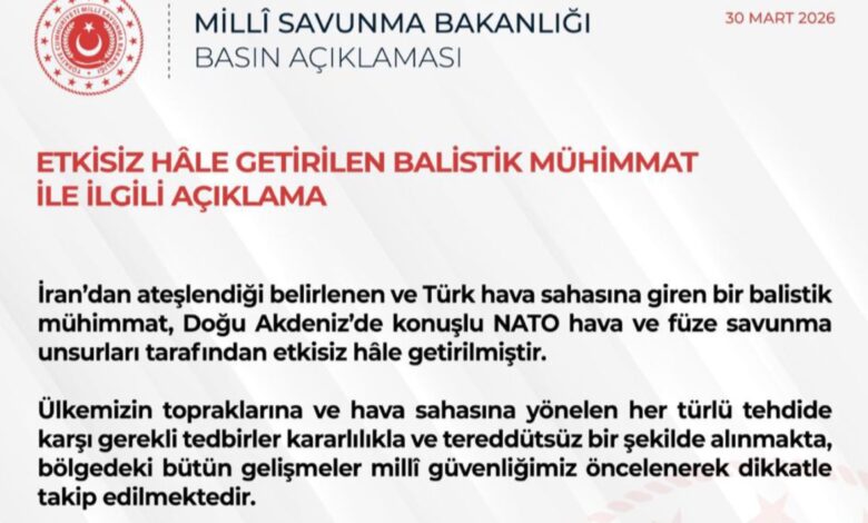 Millî Savunma Bakanlığı, İran’dan ateşlenerek Türk hava sahasına giren bir balistik mühimmatın NATO hava ve füze savunma unsurları tarafından etkisiz hâle getirildiğini açıkladı.