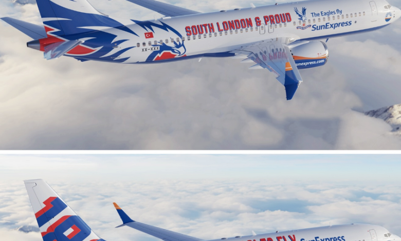 SunExpress, sponsorluk anlaşması kapsamında İngiltere Premier Lig ekiplerinden Crystal Palace için hazırlanan özel uçak giydirme (livery) tasarımlarını kamuoyu görüşüne açtı.
