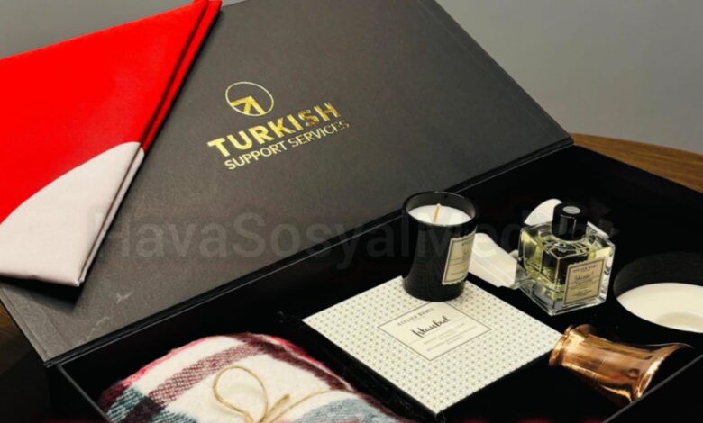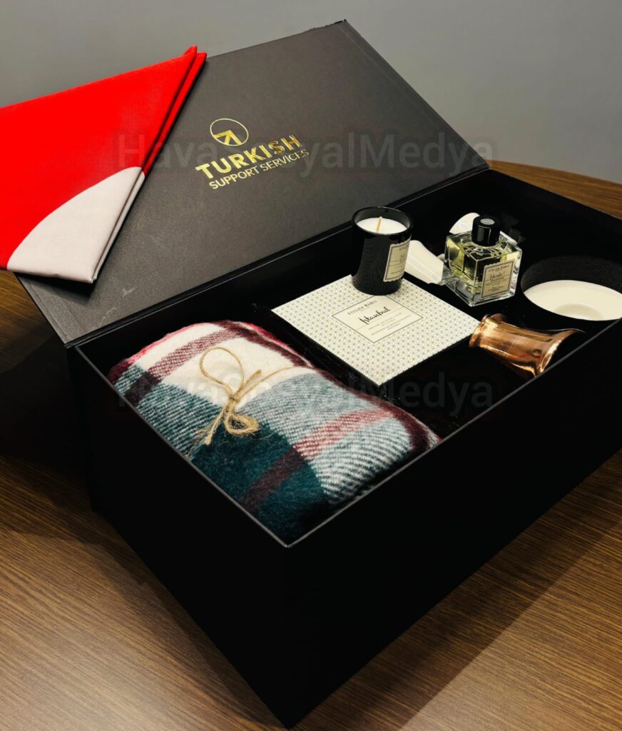 Kutu içerisinde oda kokusu ve mum, TV battaniyesi, bakır cezve ve fincan takımı ile birlikte geleneklerimizi yaşatmak adına bir de Türk Bayrağı yer alıyor.