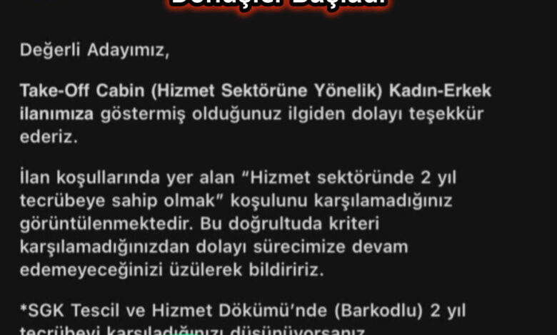 Türk Hava Yolları’nın Take-Off Cabin programı kapsamında yapılan başvurularla ilgili yeni bilgilendirmeler adaylara iletilmeye başladı. Şirket tarafından gönderilen resmi yazışmalarda, hizmet sektöründe en az iki yıl deneyim şartının titizlikle değerlendirildiği, SGK Tescil ve Hizmet Dökümü üzerinde bu tecrübeyi karşılamayan adayların süreçte ilerleyemeyeceğinin bildirildiği ifade edildi. THY, kriterleri sağladığını düşünen adayların ilgili birimle iletişime geçerek durumlarını yeniden değerlendirmeye sunabileceklerini belirtdi. Böylece program kapsamında başvuru kontrol sürecinin yeniden aktive edildiği ve aday dönüşlerinin başladığı görüldü.