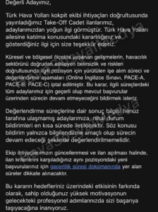 THY ayrıca, değerlendirme süreçlerine ilişkin nihai durum bilgisinin henüz kendilerine ulaşmadığı adaylara en kısa sürede ayrıca dönüş yapılacağını belirtti. Gönderilen bildirimin yalnızca bilgilendirme amaçlı olduğu, sürecin devam edeceği şeklinde yorumlanmaması gerektiği de mesajda yer aldı.