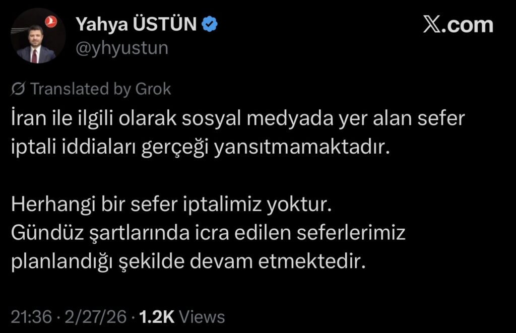 Üstün açıklamasında, “İran ile ilgili olarak sosyal medyada yer alan sefer iptali iddiaları gerçeği yansıtmamaktadır. Herhangi bir sefer iptalimiz yoktur. Gündüz şartlarında icra edilen seferlerimiz planlandığı şekilde devam etmektedir” ifadelerini kullandı.