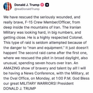 Trump, yaptığı açıklamada İran’ın dağlık bölgesinde bulunan ağır yaralı F-15 mürettebatından bir personelin kurtarıldığını duyurdu. İlk operasyonda pilotun, ikinci operasyonda ise subay olduğu belirtilen diğer mürettebatın çıkarıldığını aktaran Trump, söz konusu görevin yüksek risk altında gerçekleştirildiğini ifade etti.