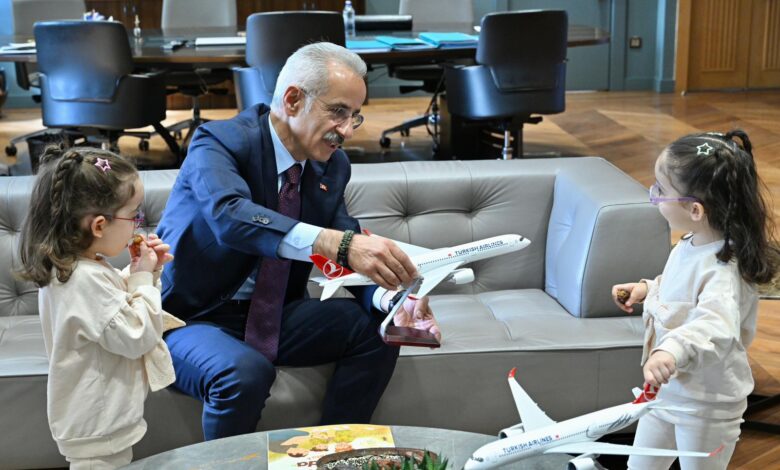 Ulaştırma ve Altyapı Bakanı Abdulkadir Uraloğlu, babalarıyla birlikte uçak inişlerini izlerken kaydedilen görüntüleriyle büyük beğeni toplayan ikiz kardeşler Erva ve Zümra’yı Ulaştırma ve Altyapı Bakanlığı’nda ağırladı.