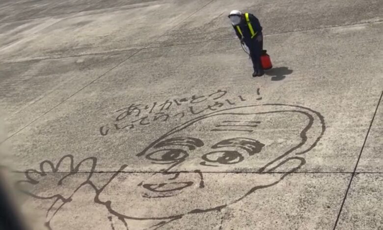 Japonya’nın Kyushu bölgesindeki Kagoshima Havalimanı’nda görevli bir yer hizmetleri personeli, uçağın kalkışından önce apron zeminine suyla bir veda mesajı yazdı. Mesajda Japonca olarak “Teşekkürler, iyi yolculuklar” ifadeleri yer alırken, çizimin içinde bölgenin simge isimlerinden biri olan Takamori Saigo’nun portresi bulunuyordu.